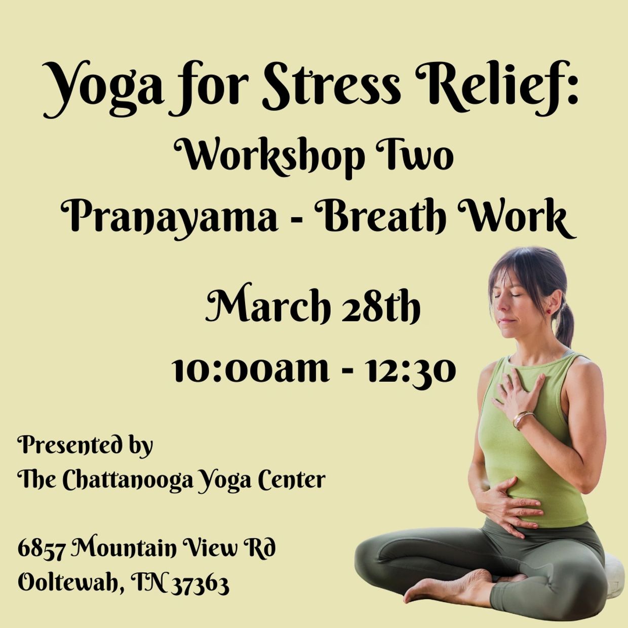 The Second Workshop on March 28, 2026 (New Date) will focus on "Pranayama - Breath Work." 10:00am - 12:30pm